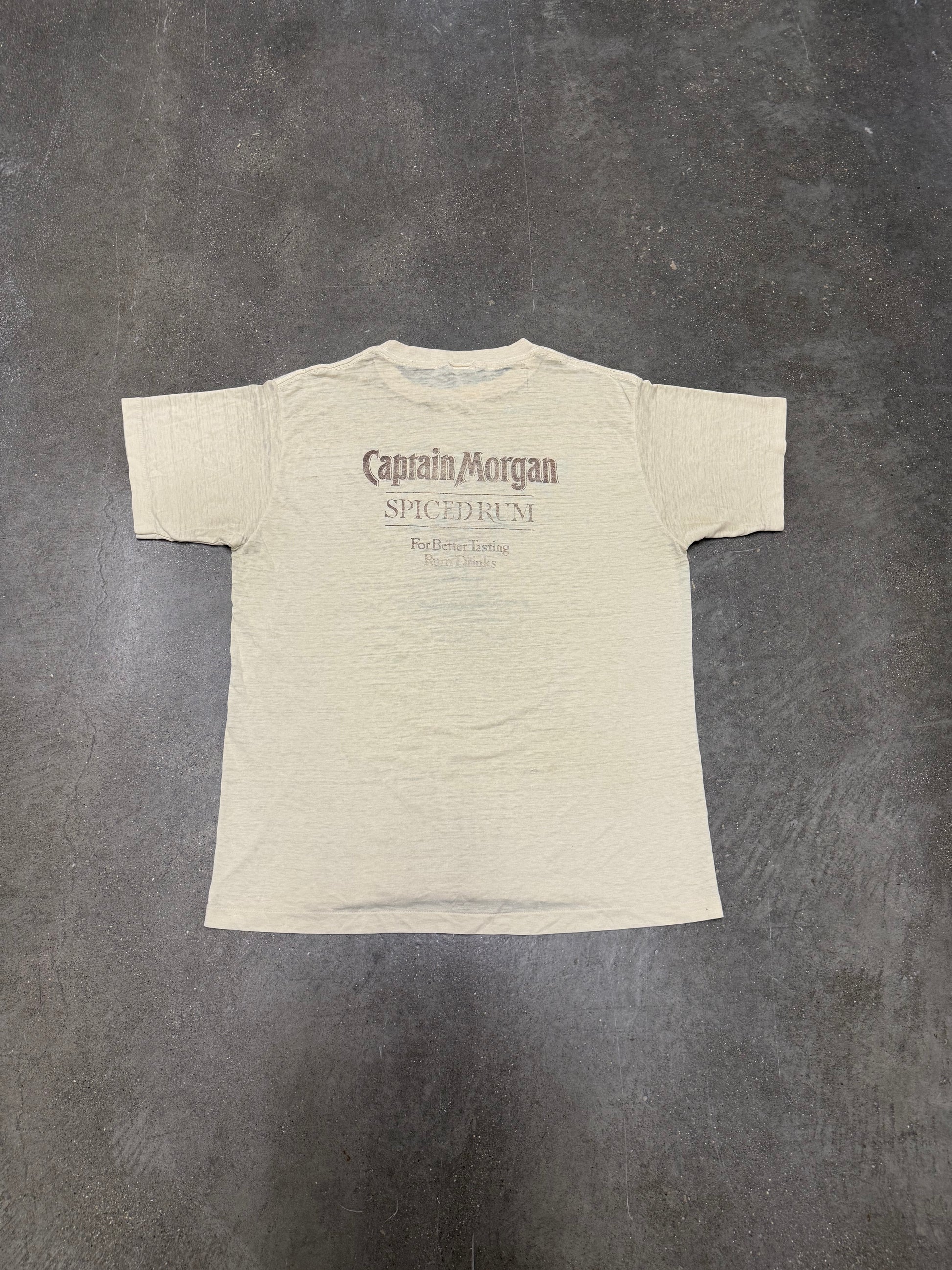 True vintage tee featuring classic Captain Morgan graphics and single stitch detailing. A rare find for collectors and retro rum lovers.