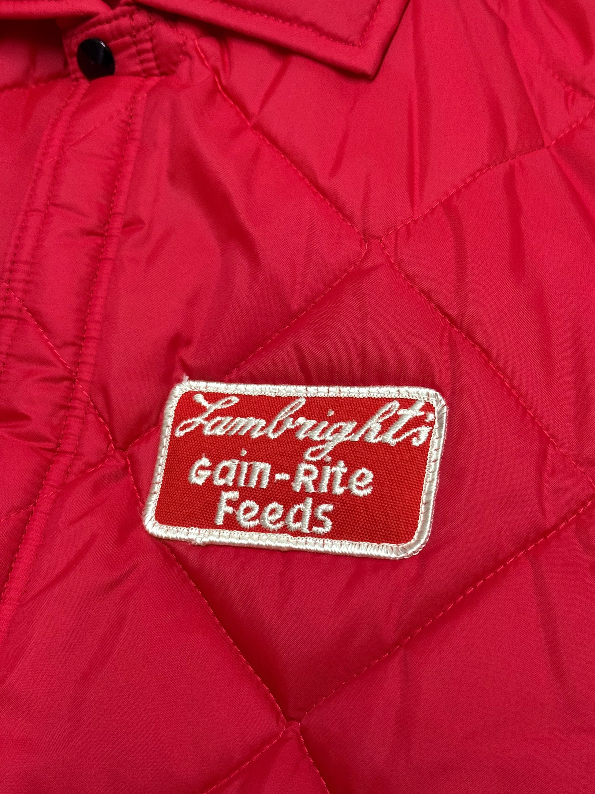 1980s vintage red quilted work jacket with classic utilitarian design and authentic worn-in character. A timeless cold-weather layer featuring durable construction and true Americana workwear style, ideal for vintage and heritage clothing enthusiasts.