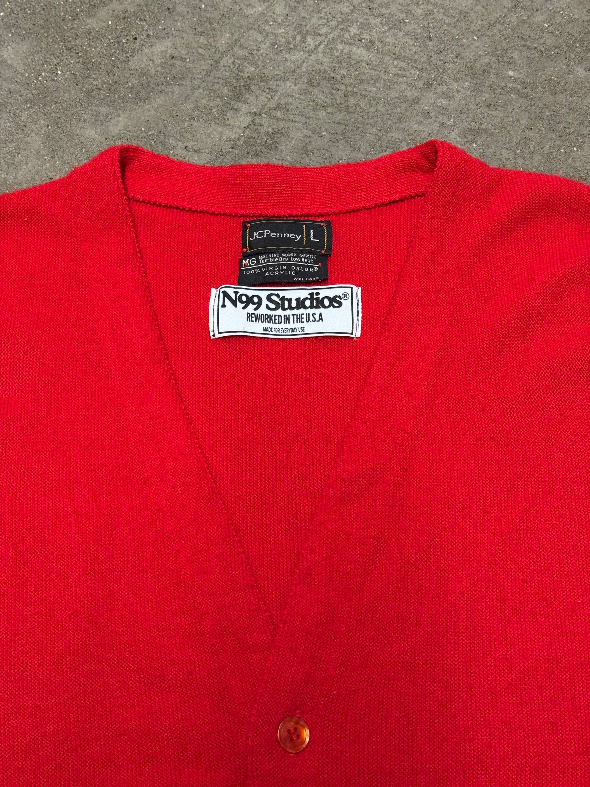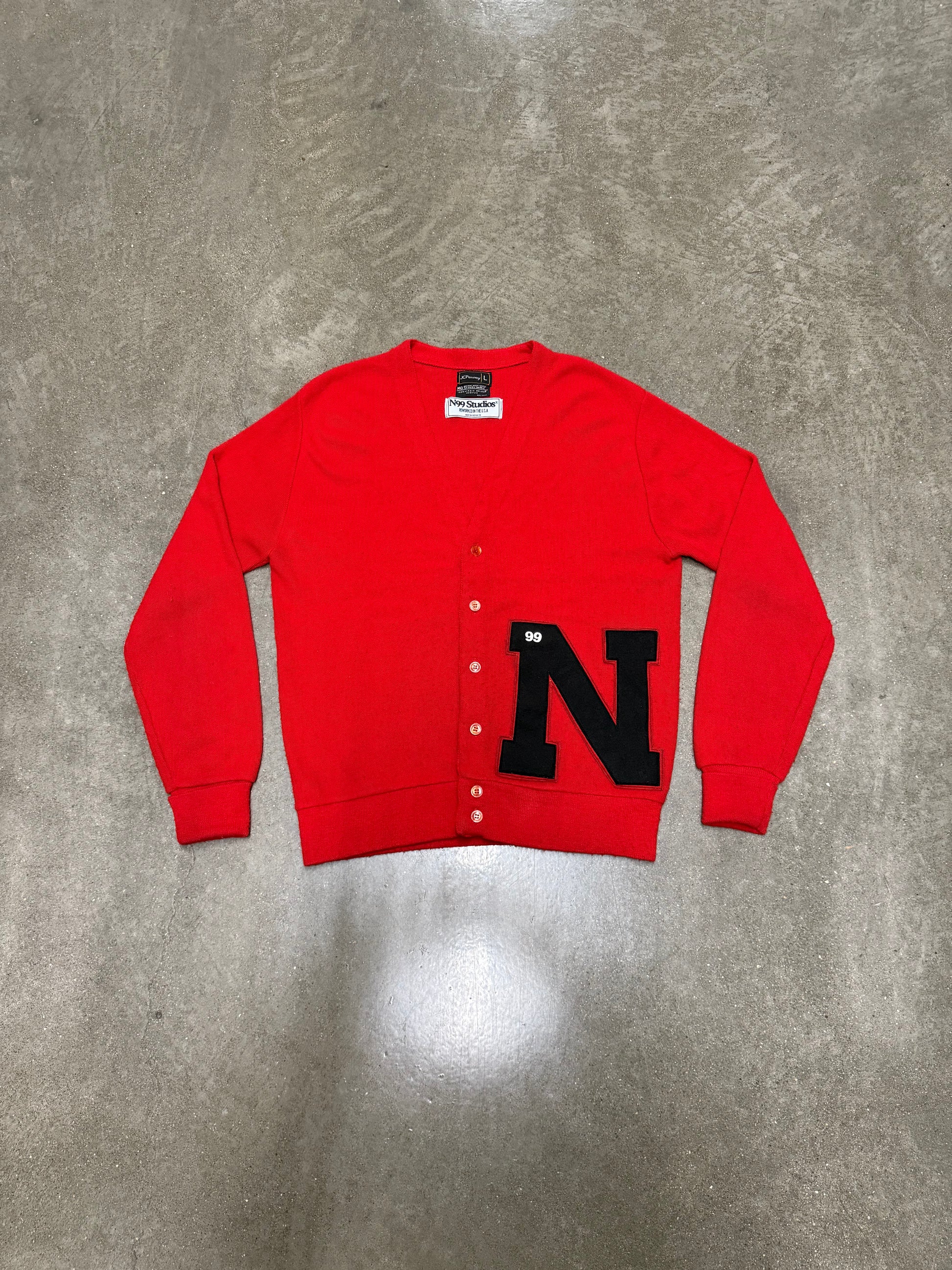 Vintage cardigan with a vintage "N" varsity patch inspired by 1940s varsity sweaters. Featuring two silver pins.