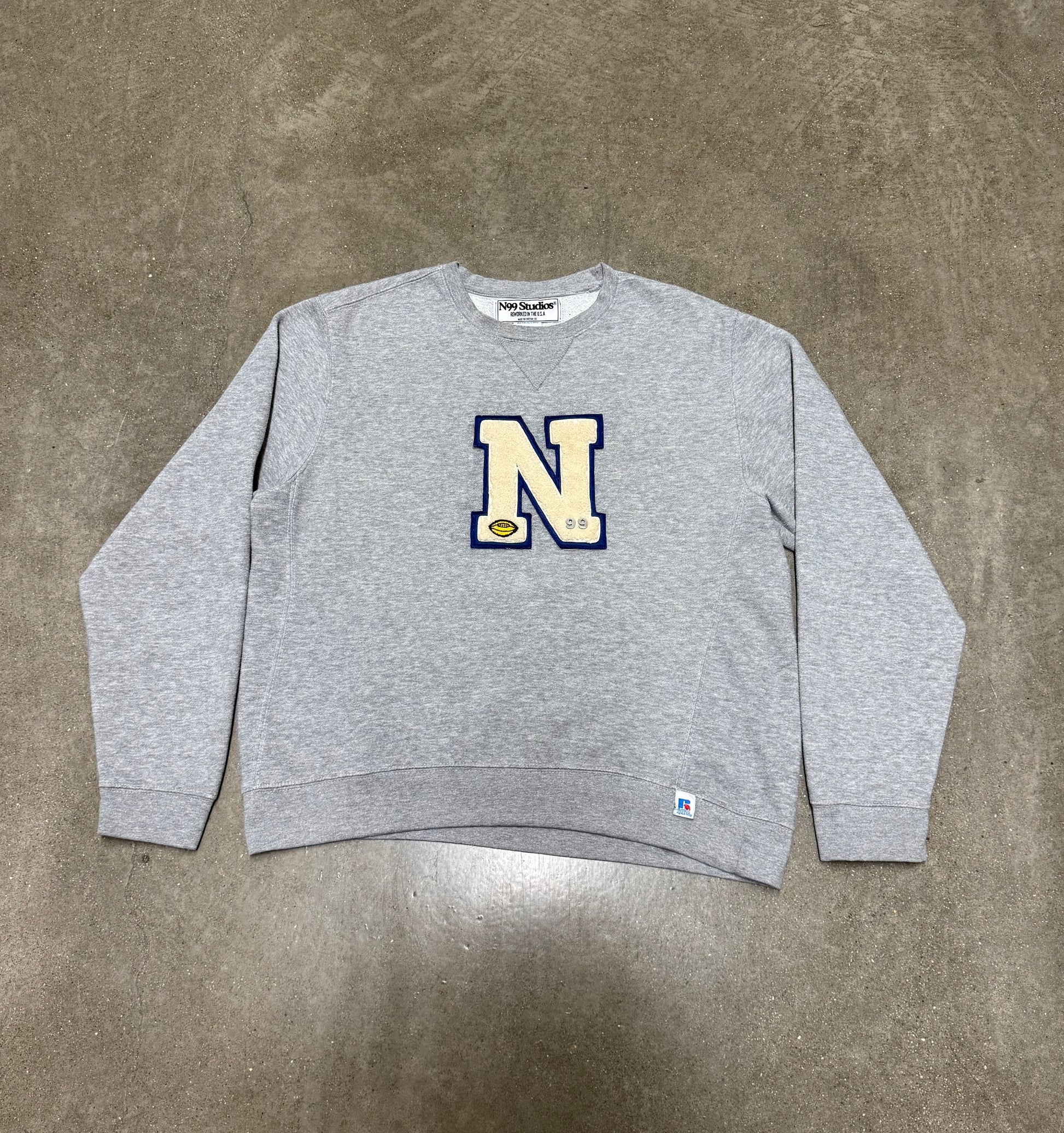 Vintage Russell crewneck with a vintage "N" varsity patch inspired by 1940s varsity sweaters. Featuring two silver pins.