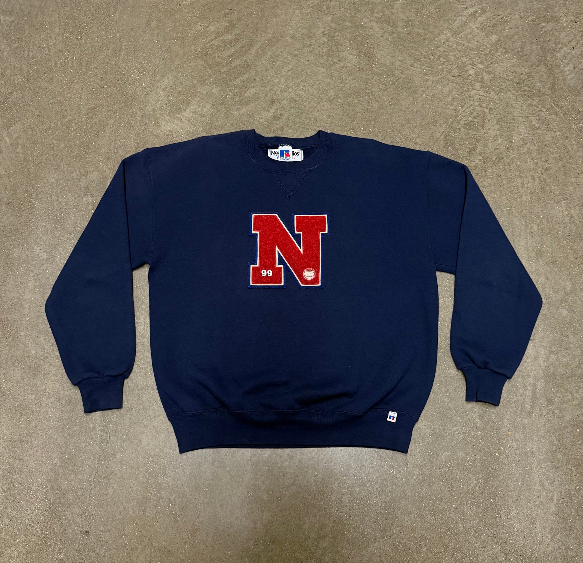 Vintage Russell crewneck with a vintage "N" varsity patch inspired by 1940s varsity sweaters. Featuring two silver pins.